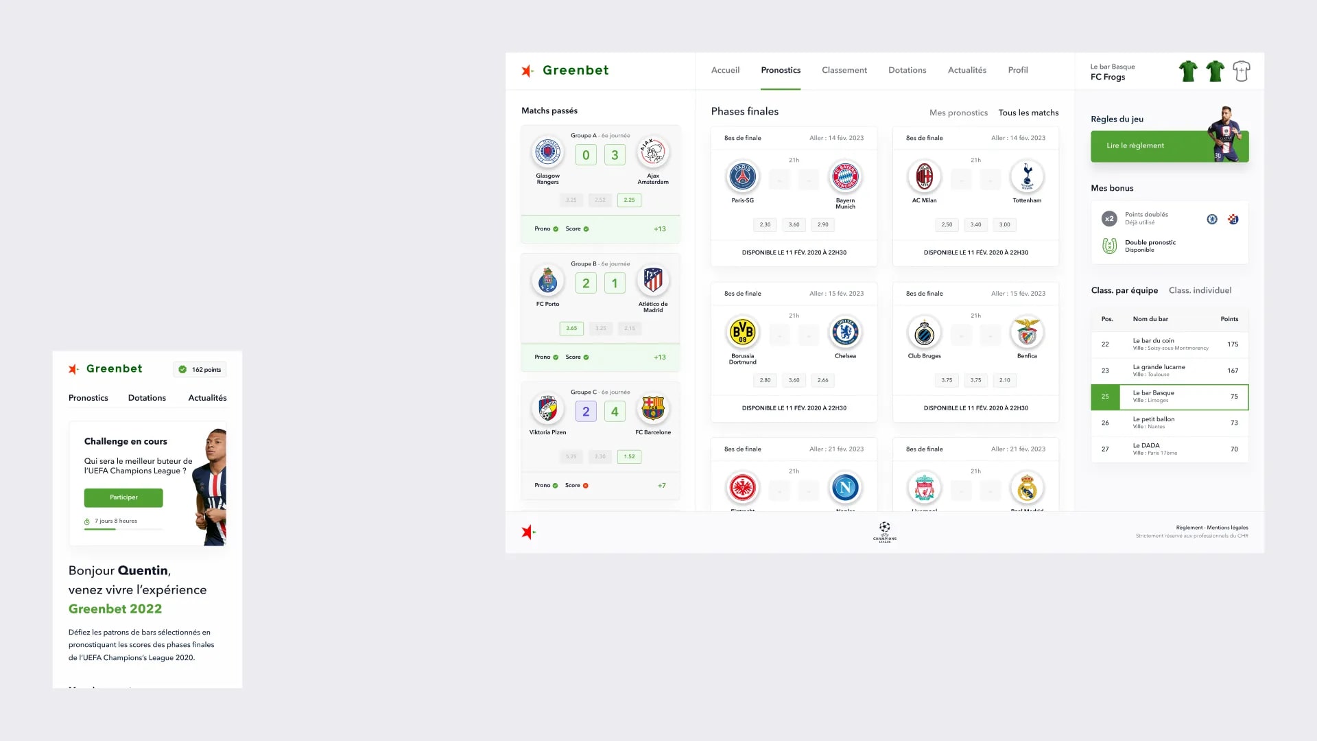 Greenbet est une application de paris sportifs développée pour les patrons de bar partenaires d'Heineken et leurs salariés, imaginée à l'occasion de la Ligue des Champions 2022 de football.